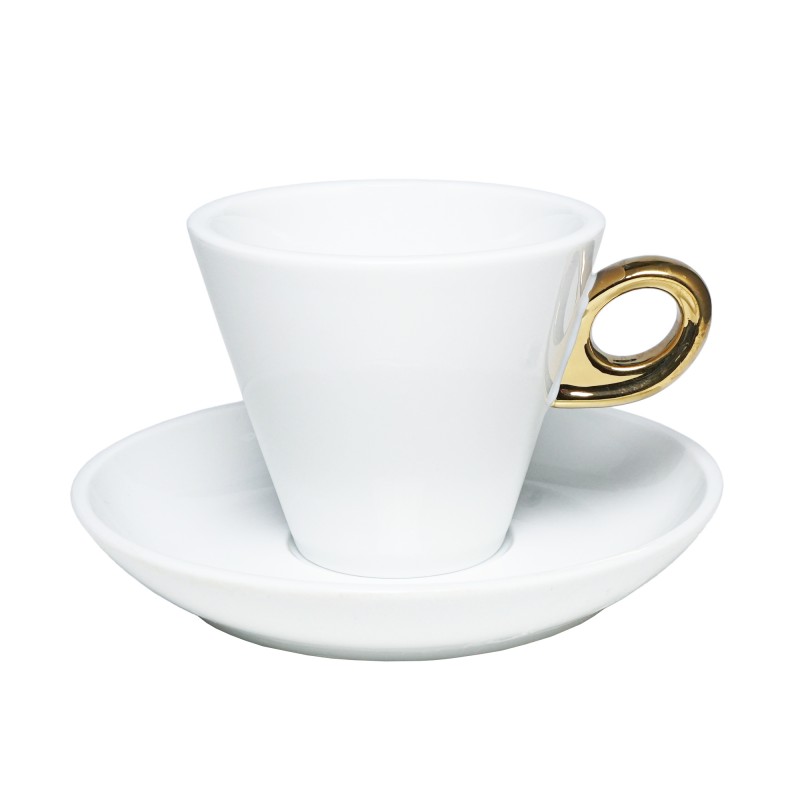 Biała porcelanowa filiżanka ze złotym uchem, która idealnie nadaje się do americano. Również jest eleganckim podarunkiem dla kawosza!