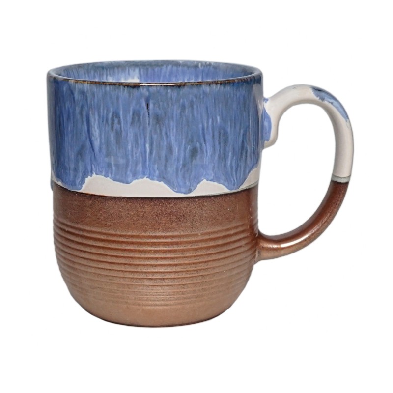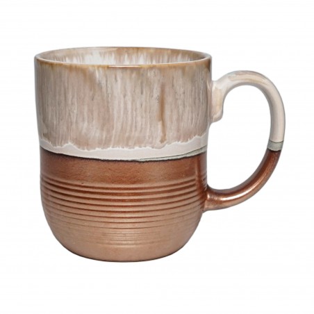 Piękny kamionkowy kubek Cooper ozdobiony dwoma strukturami szkliwionej kamionki. Reaktywne szkliwo ukazuje przyjemny gradient kolorów, a metaliczne wykończenie, nawiązuje do wysokiej jakości miedzi. Dodatkowym wizualnym atutem jest żłobiona struktura dolnej powłoki. Całość jest niezwykle elegancka i ciekawa. Duża objętość sprawia, że można z niego pić zarówno kawę jak i herbatę. Kubek ten, doskonale również sprawdzi się na szykowny podarunek. Dostępny w dwóch wersjach kolorystycznych.