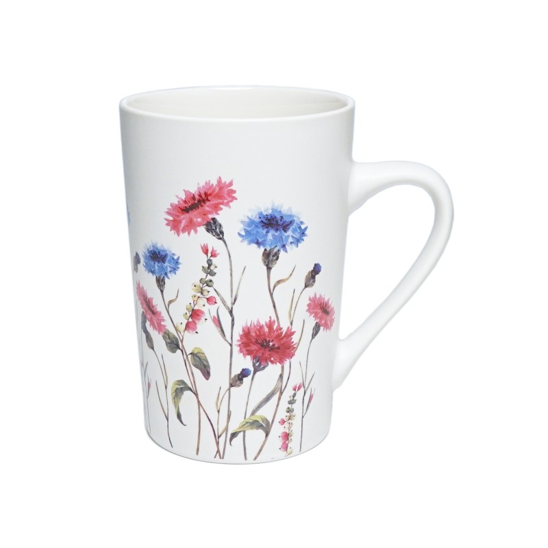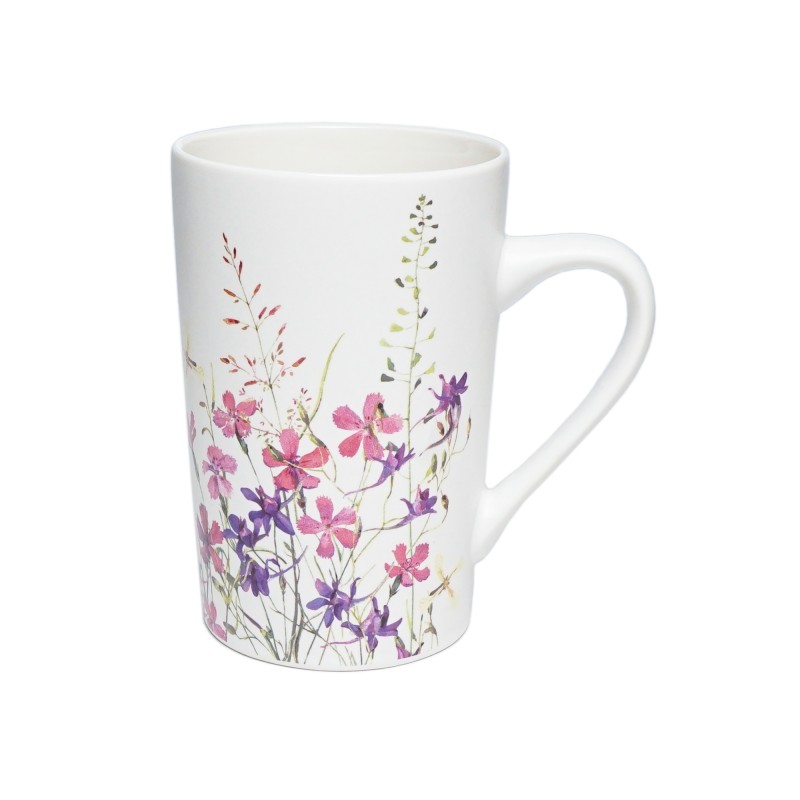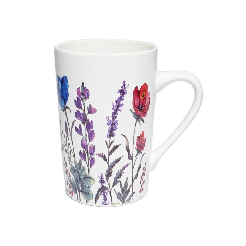 Uroczy porcelanowy kubek z motywem kwitnącej łąki i delikatnych kwiatów. Matowe wykończenie dodaje mu elegancji.