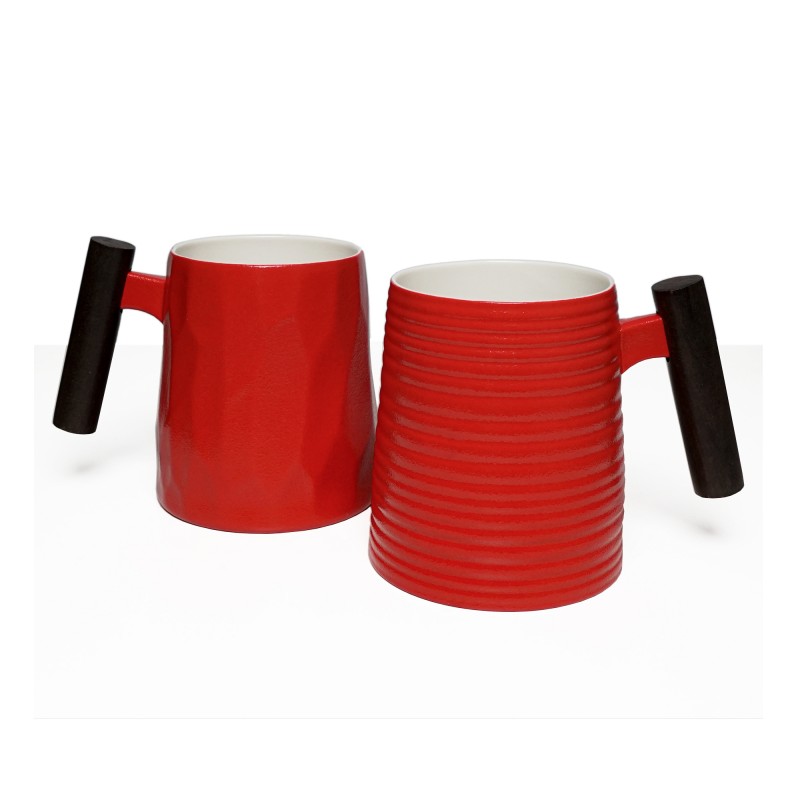 Porcelanowy kubek z piaskową otoczką w pięknym czerwonym kolorze. Charakteru i nowoczesności dodaje mu uchwyt z palisandru (egzotycznego drzewa – zwanego również różanym).