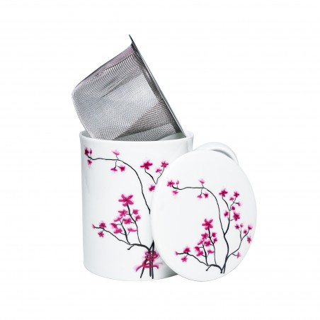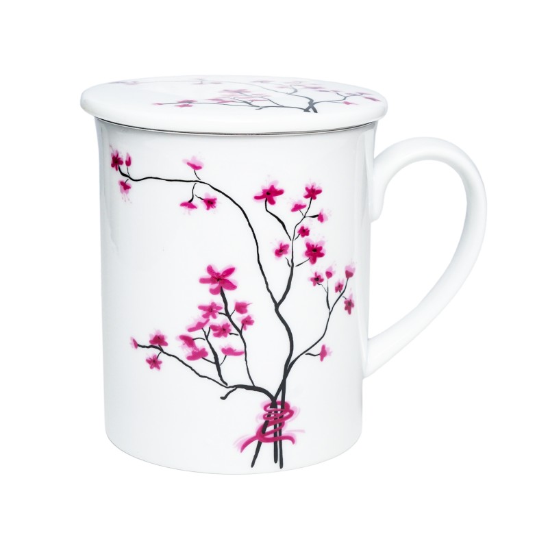 Kubek z motywem kwitnących kwiatów wiśni wykonany z chińskiej porcelany kostnej w komplecie z zaparzaczem.