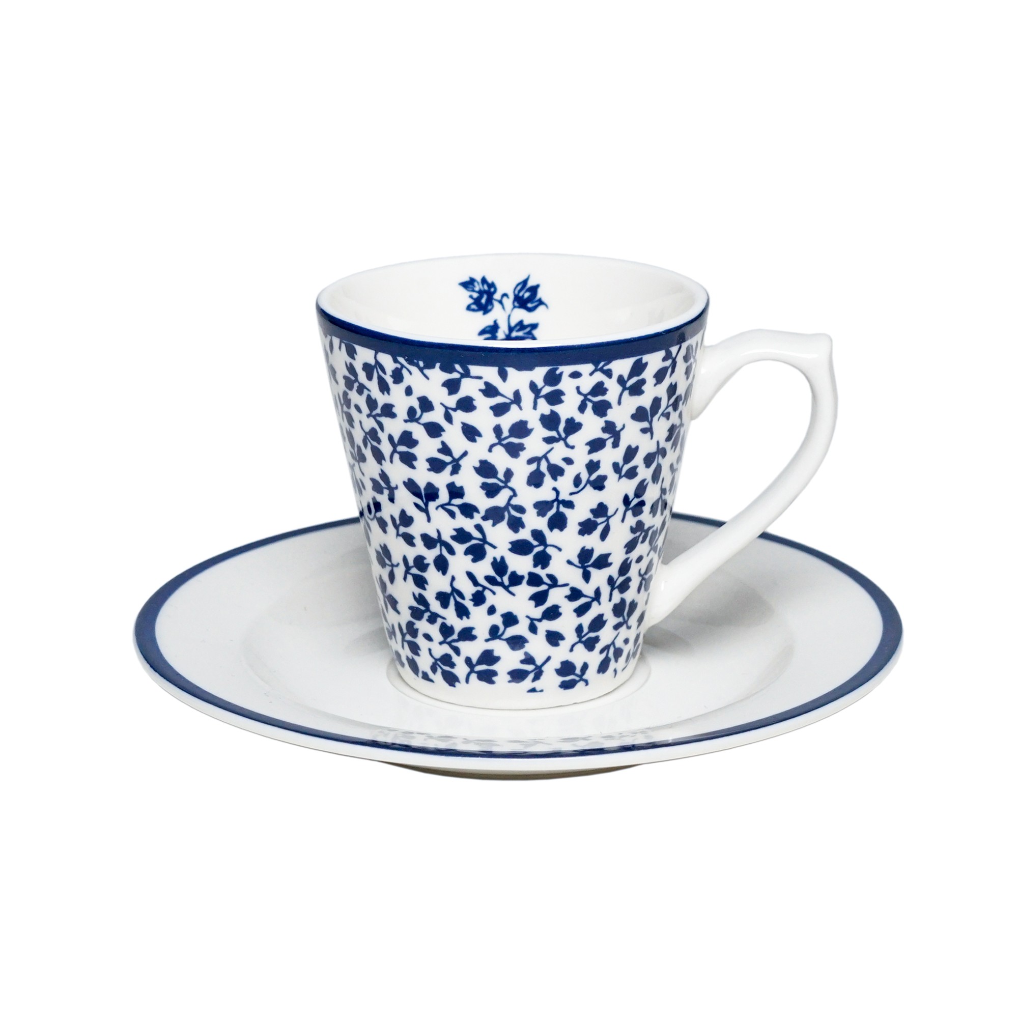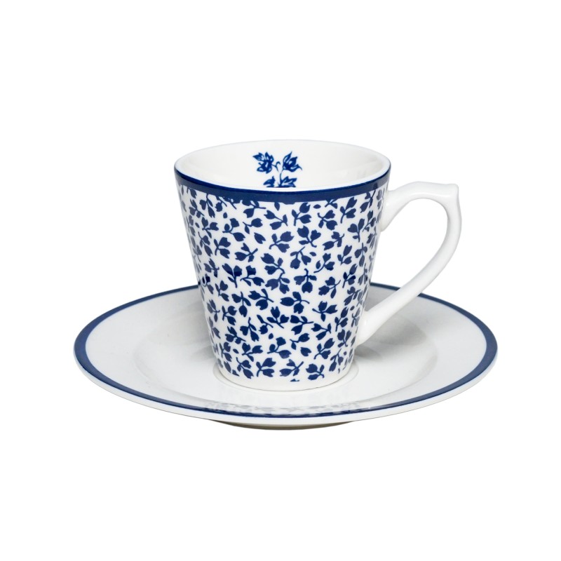 Filiżanki do espresso marki Laura Ashley - Floris. Wykonana z wysokiej jakości porcelany kostnej. Filiżanka w białym kolorze ozdobiona niebieskimi kwiatuszkami. Dołączony w komplecie spodek dodaje eleganckiego charakteru.