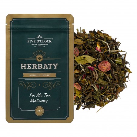 Biała herbata Pai Mu Tan z dodatkiem malin, czerwonych płatków róży i liści jeżyn. Wyjątkowe połączenie smaku i aromatu. Tajemnicza i zmysłowa kompozycja.