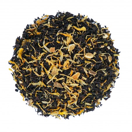 Czarna indyjska herbata Assam z cytrusowym twistem. Skórka pomarańczy, werbena cytrynowa i nuta bergamoty dają doskonale orzeźwiający efekt. Całość przyozdobiona kwiatami nagietka.