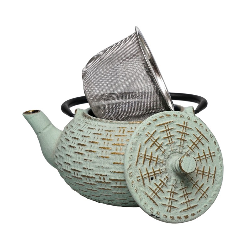 Miętowo-złoty żeliwny dzbanek z ciekawymi wypukłymi zdobieniami o objętości 800ml. Długo utrzymuje ciepło, a zawarty w zestawie zaparzacz ułatwia użytkowanie.