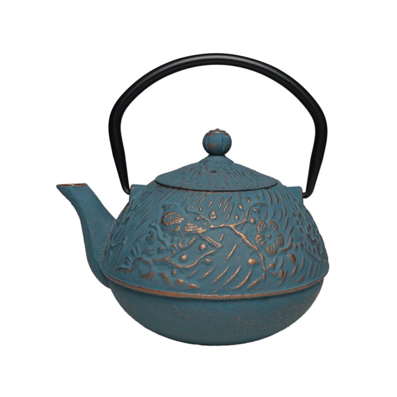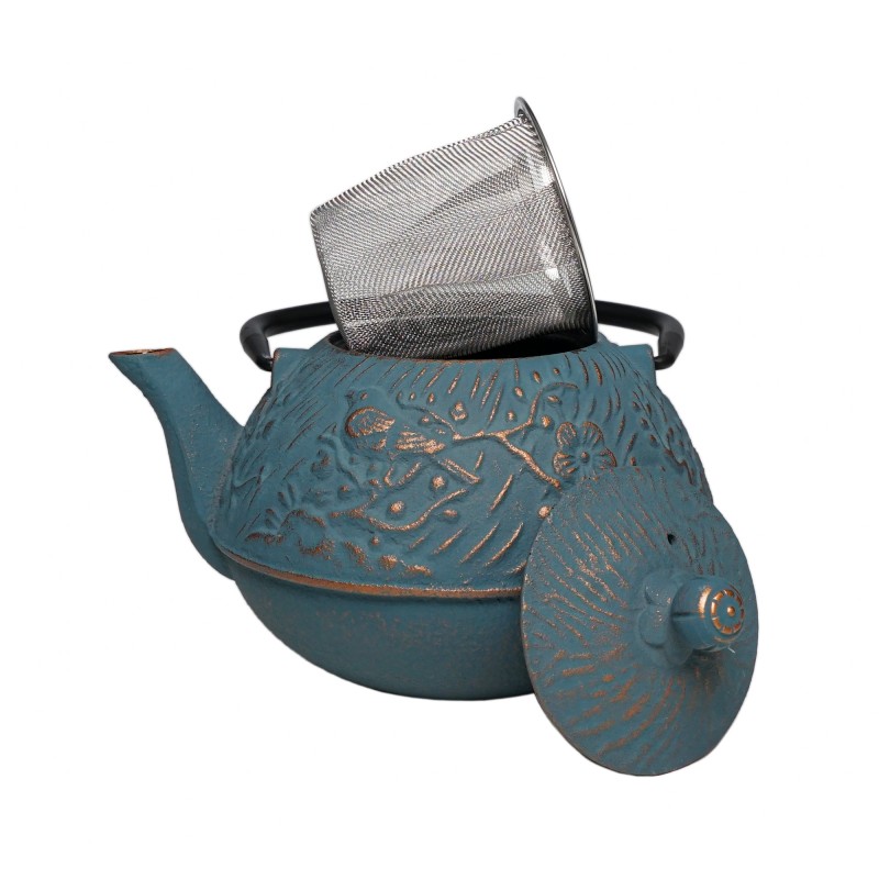 Ciekawy i zdobny żeliwny dzbanek Meng o pojemności 650ml. Piękny wypukły ornament w kwiaty i ptaki oraz piękne niebiesko- złote kolory nadają mu niezwykłości.