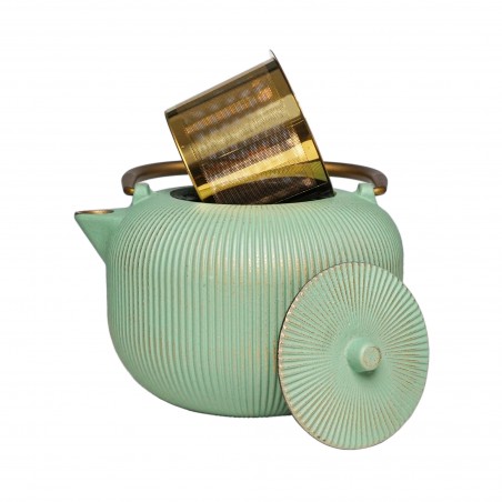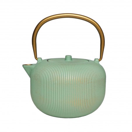 Uroczy żeliwny dzbanek w przyjemnym miętowym kolorze ze złotymi elementami i dopasowanym zaparzaczem. Solidne wykonanie i wytrzymałość w delikatnej i lekkiej estetyce.