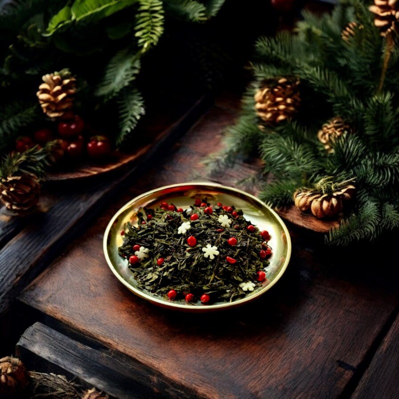 Zielona chińska herbata z dodatkiem ziarenek różowego pieprzu oraz goździków. Odrobina czekolady oraz cukrowe gwiazdki urozmaicają kompozycję.