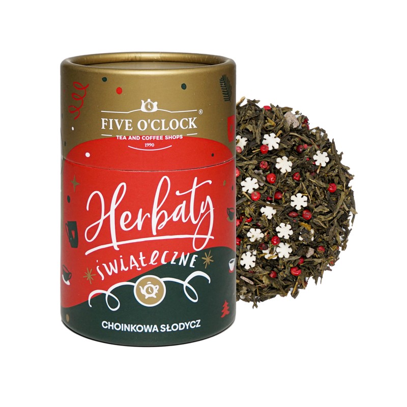 To wyjątkowa kompozycja zielonej herbaty liściastej, ozdobiona cukrowymi gwiazdkami i różowym pieprzem, a jej smak wzbogacają kawałki czekolady
