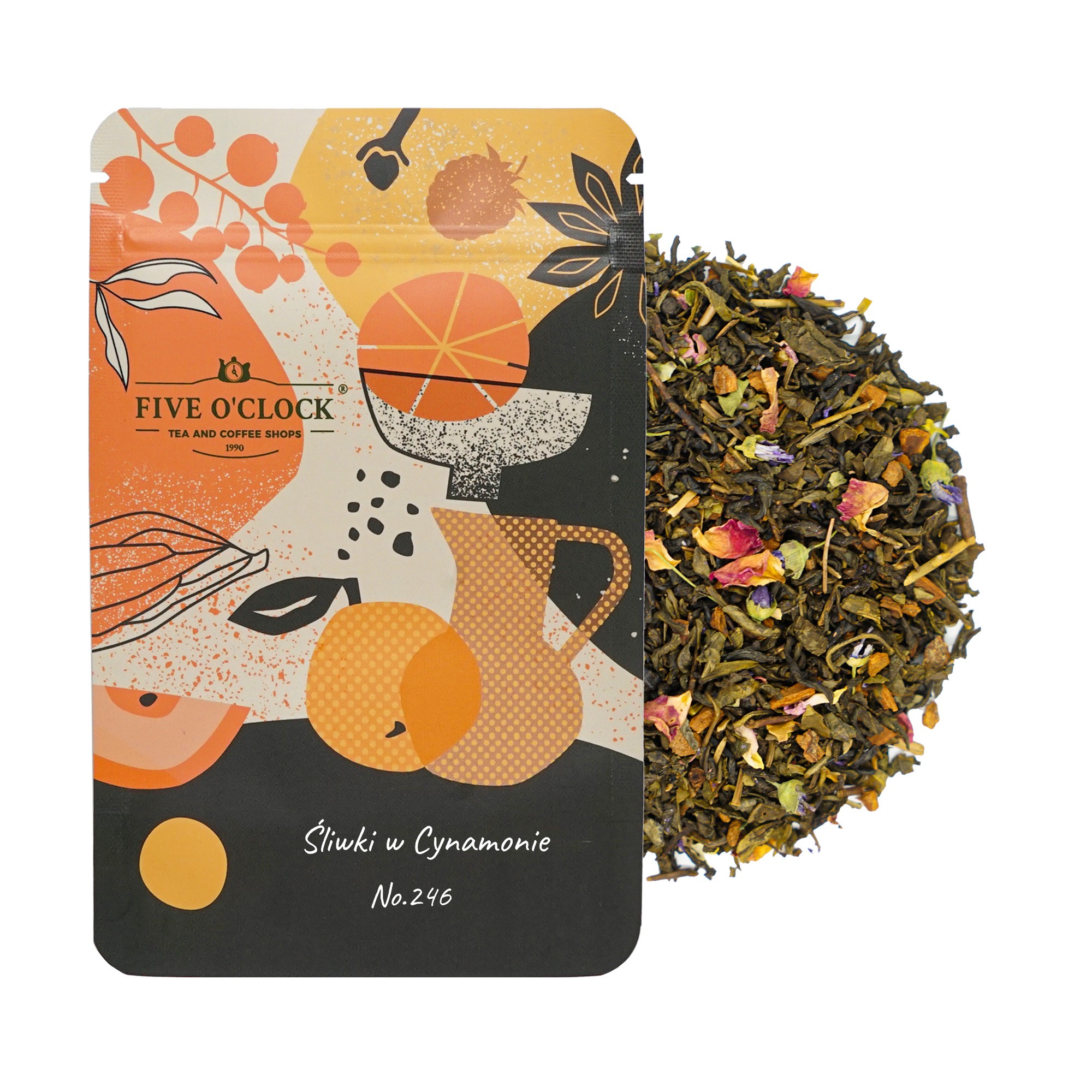 Oryginalne połączenie listków zielonej herbaty typu sencha z cynamonem i cząstkami śliwek, urozmaicone płatkami kwiatów. Propozycja na chłodne dni, która otula ciepłem smaku i aromatu.