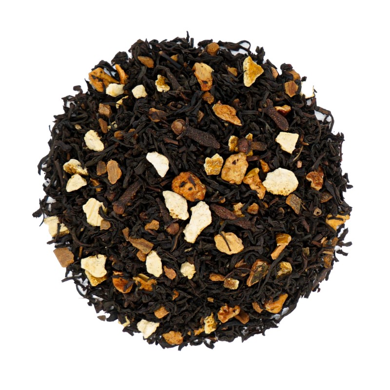 Herbata czarna liściasta (78,1%), cząstki jabłek, goździki, skórka pomarańczy, cynamon, naturalny aromat pomarańczowy
