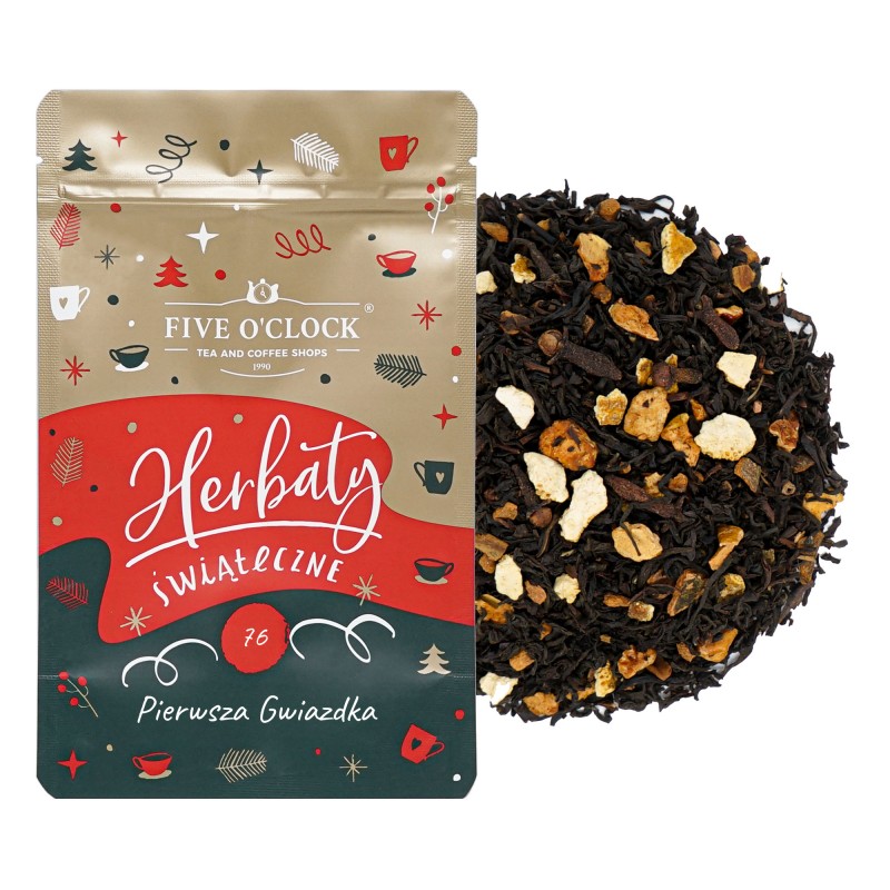 Kompozycja czarnej herbaty z aromatyczną skórką pomarańczy i cząstkami jabłek. Dodatek cynamonu i goździków wprowadza świąteczny akcent i umila oczekiwanie na tę jedyną, wyjątkową gwiazdkę w wigilijny wieczór.