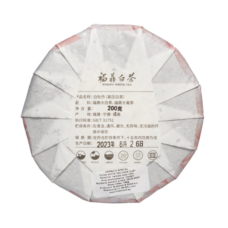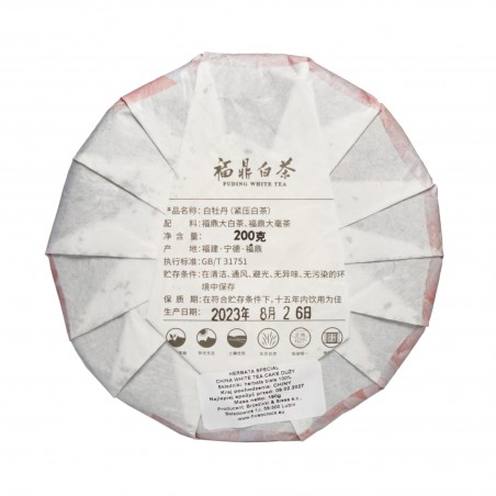 Herbata biała Pai Mu Tan / Bai Mu Dan w wersji sprasowanej w tradycyjny tzw. „tea cake”, „placek herbaty”. Produkowana jest w pobliżu miasta Fuding w prowincji Fujian. W kulturze chińskiej jest to tradycyjna forma produkcji, przechowywania i sprzedaży m.in. tej popularnej białej herbaty. China White Tea Cake pochodzi z Fujian, prefektury Ningde, Fuding. Duża ilość słońca, dobra gleba i tradycyjne umiejętności plantatorów gwarantują precyzję tworzonej herbaty.