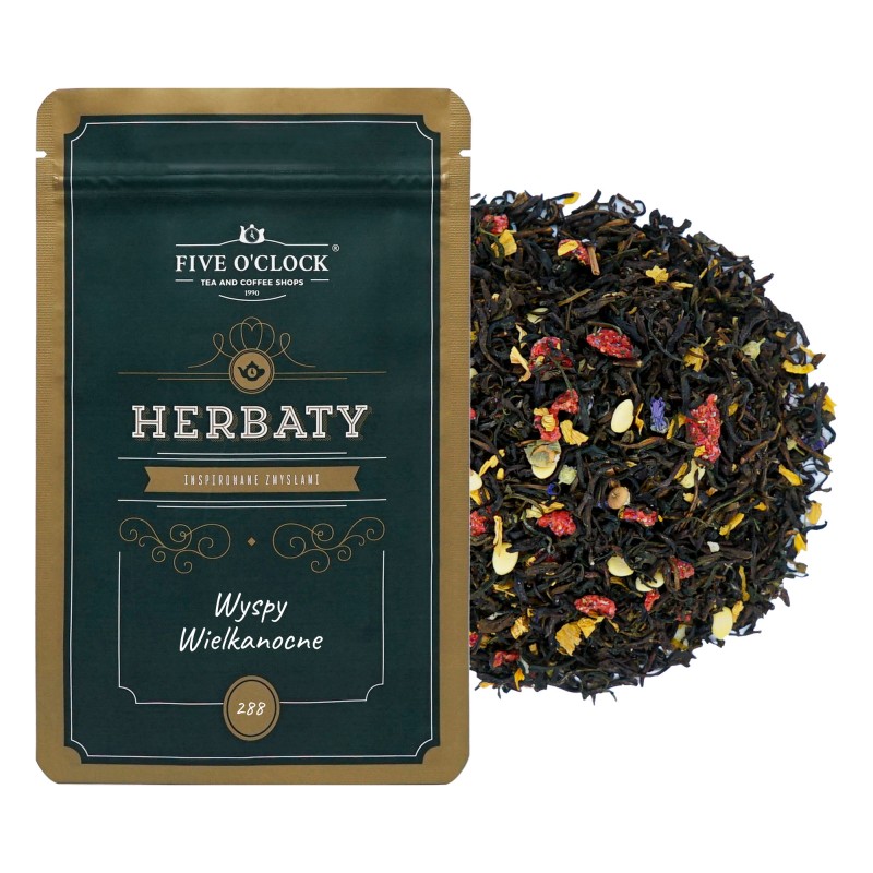 Biała i zielona chińska herbata z dodatkiem cząstek truskawek, płatków słonecznika i malwy urozmaicona uroczymi cukrowymi pisankami.
