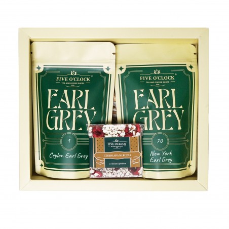 Prezent łączący klasykę z wyrafinowaną kompozycją smaków. W zestawie znajduje się czarna herbata Earl Grey w klasycznym cejlońskim wydaniu oraz chińska herbata z aromatem bergamotki i śliwki, z wędzoną herbatą oraz kwiatami jaśminu i bławatka. Mała czekoladka dopełnia całość, wnosząc subtelną słodycz i elegancję. To idealny prezent dla miłośników tradycji, którzy cenią też kreatywne smaki.