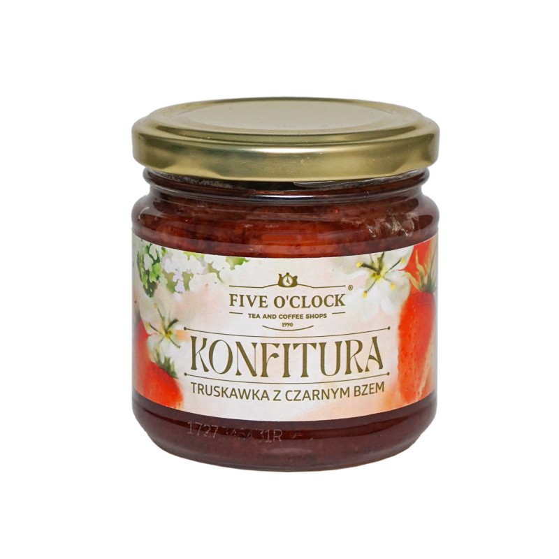Ciekawe połączenie soczystych truskawek z aromatycznym syropem z kwiatów czarnego bzu. Doskonała jako dodatek do herbaty, lemoniady czy słodkich dań. Ręcznie wyrabiana, specjalnie dla Five o'clock, w małej manufakturze.