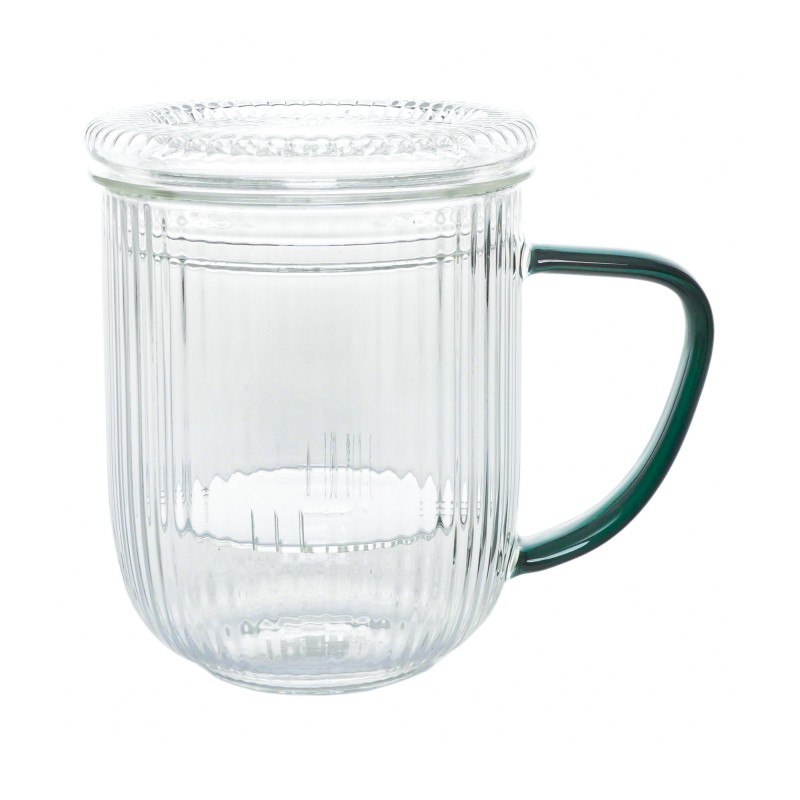 Uroczy kubek wraz z zaparzaczem w odcieniu zieleni, wykonany ze szkła o ciekawej, dekoracyjnej strukturze, który przyciąga uwagę i efektownie prezentuje serwowane napoje.
