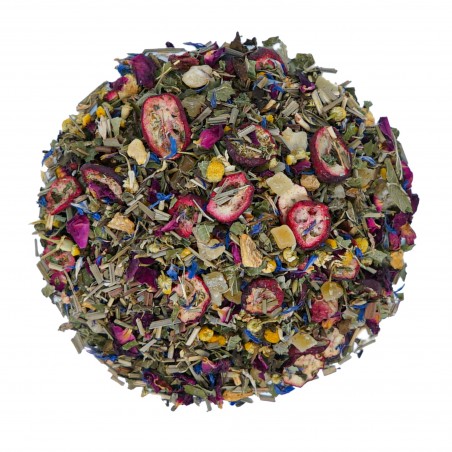 Zaskakująca mieszanka owocowo-ziołowa. W jej składzie odnajdziesz soczyście egzotyczne owoce mango i ananasa oraz rodzimą nieco wytrawną żurawinę. Słodyczy nadaje jej dodatek rumianku oraz listków jeżyn, a nieco świeżości trawa cytrynowa i imbir. Całość dopełniają kolorowe płatki kwiatów róży, lawendy i chabru. Doskonała do degustacji przez cały dzień, na ciepło i na zimno. Dla młodszych i starszych koneserów mieszanek ziołowo-owocowych.
