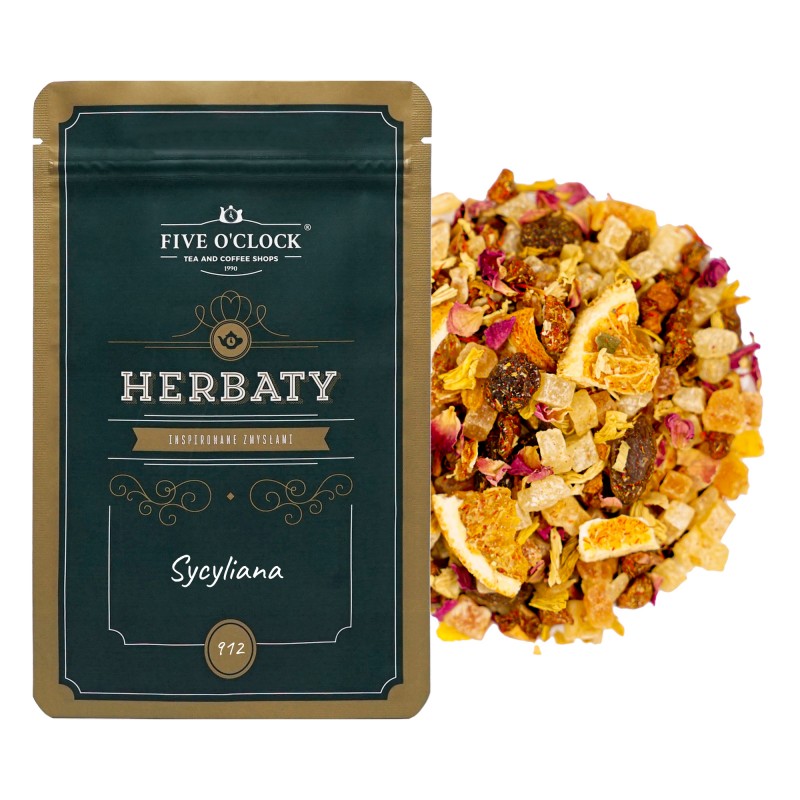 Kompozycja złożona z cząstek kandyzowanego ananasa i papai, skórki pomarańczy, wyciągu z cytryny, pomarańczy i marakui, rodzynek i płatków kwiatów. Przyjemnie słodka. Idealnie orzeźwia i rozgrzewa.