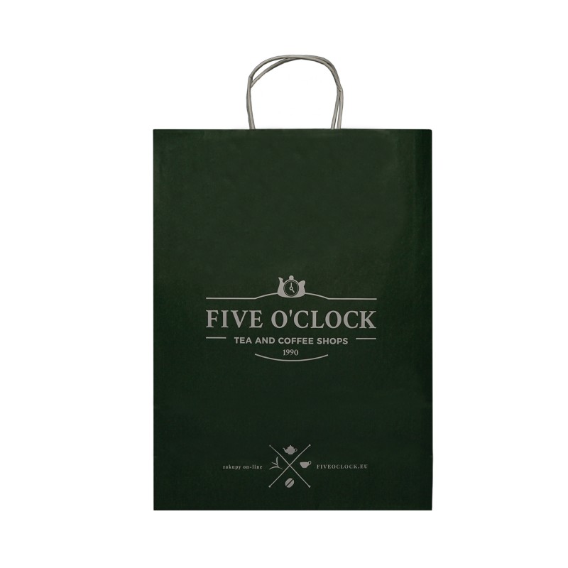 Duża torba papierowa, ozdobiona logiem Five o'clock to szybka i wygodna forma opakowania. Idealna do zapakowania większego herbacianego bądź kawowego prezentu.
