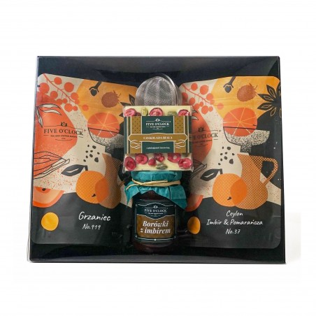 Starannie skomponowany zestaw prezentowy, który łączy w sobie korzenne aromaty, słodycz i elegancję. Zawarta w prezencie czarna herbata z dodatkiem pomarańczy i imbiru otuli zmysły, a owocowa mieszanka uprzyjemni każdą jesienną chwilę. Smak naparów subtelnie uzupełni konfitura oraz rozpływająca się w ustach mała czekoladka. Do zestawu dołączony jest także praktyczny zaparzacz, który sprawia, że parzenie herbaty staje się jeszcze przyjemniejsze.