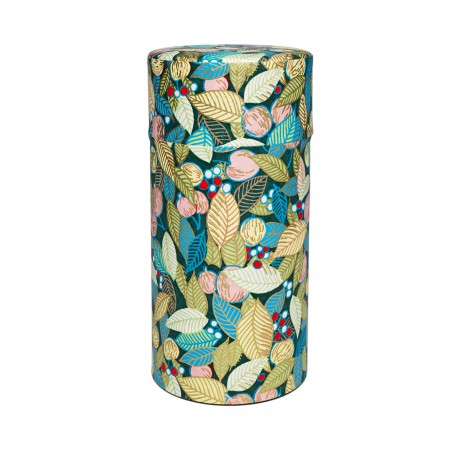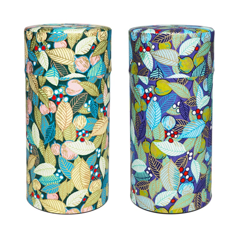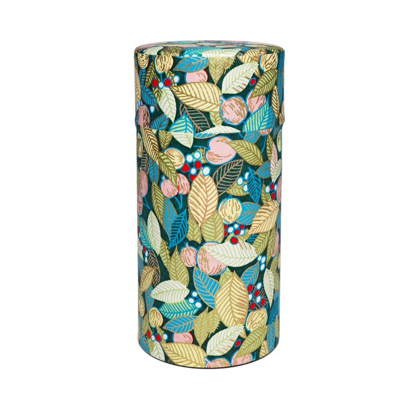 Japońska puszka ozdobiona wysokiej jakości papierem washi z piękny motywem liści, utrzymana w harmonijnych kolorach, zachwyca dbałością o detale. Dodatkowa pokrywka wewnętrzna zapewnia lepszą ochronę aromatu.