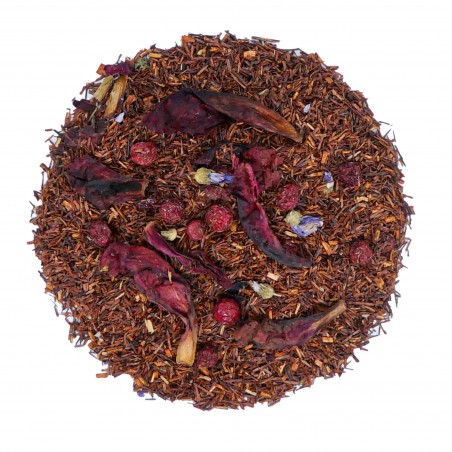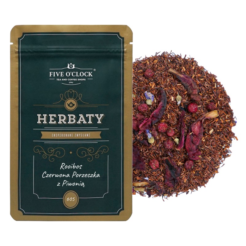 Kompozycja czerwonokrzewu afrykańskiego z owocami czerwonej porzeczki dopełniona kwiatami piwonii i malwy. Całość słodka i miodowa. Napar przyjemnie odpręża. Nie zawiera teiny, dzięki czemu doskonale sprawdzi się podczas popołudniowej i wieczornej degustacji. Idealny do parzenia w dzbanku dla całej rodziny.