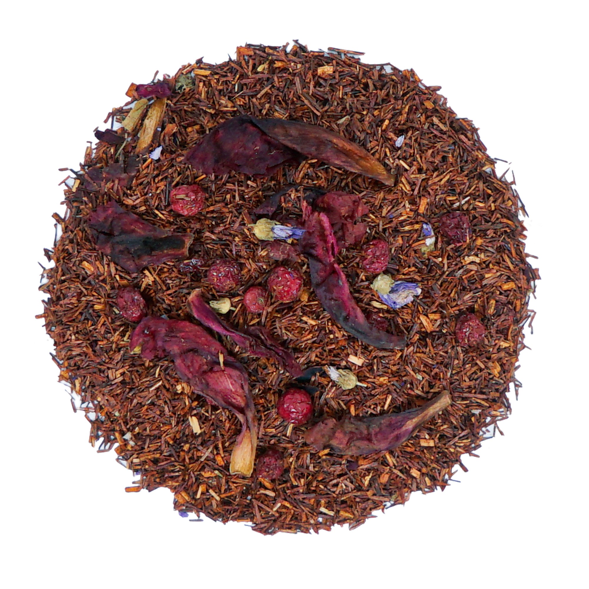 Rooibos, naturalny aromat z czerwonej porzeczki, czerwona porzeczka, płatki piwonii, płatki malwy.