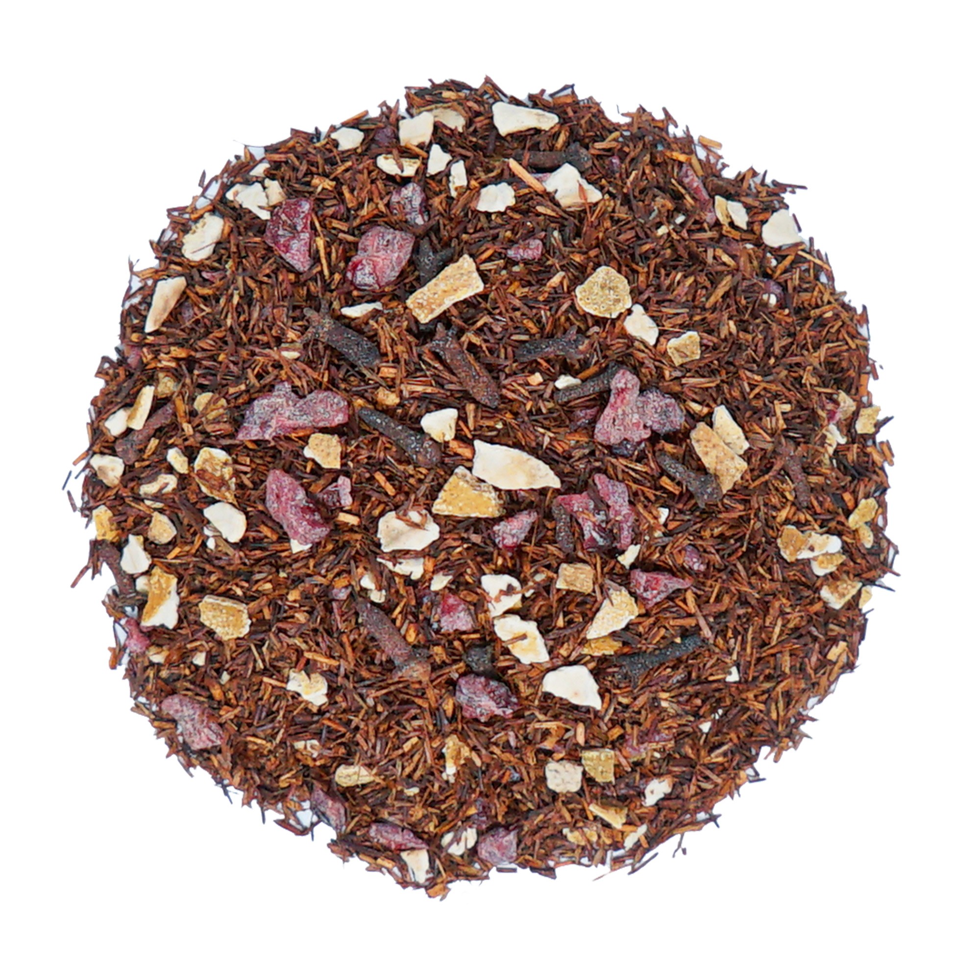 Rooibos, kawałki żurawiny (cukier, żurawina, mąka ryżowa, olej słonecznikowy), skórka pomarańczy, goździki, aromaty.