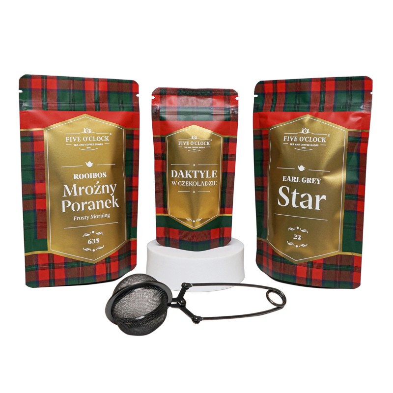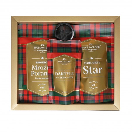 Uroczy upominek, który swoim smakiem i aromatem otuli niczym ciepły koc. W środku znajdziesz aromatyczne, rozgrzewające herbaty: czarną Earl Grey z przyprawami korzennymi oraz rooibos ze słodkimi dodatkami i nutą aromatycznych przypraw. Całość uzupełniają łakocie – słodkie daktyle w deserowej czekoladzie. Aby ułatwić parzenie, prezent zawiera także wygodny i uniwersalny zaparzacz.