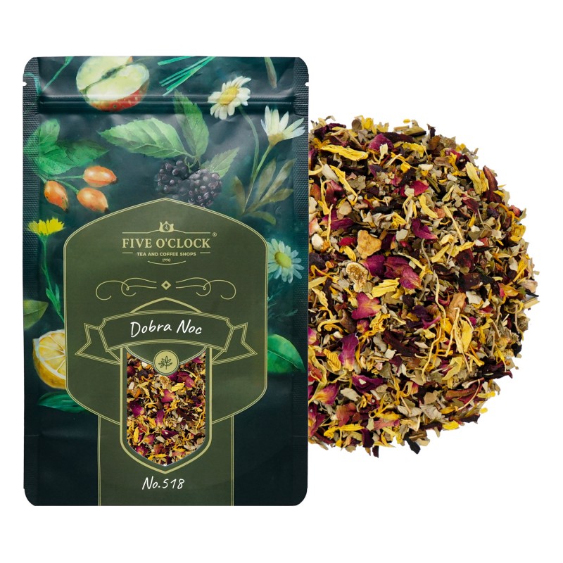 Mieszanka ziołowa składająca się z melisy, hibiskusa, listków jeżyn, płatków kwiatów, skórki pomarańczy, kardamonu i goździków. Szczególnie polecana na noc, bowiem podstawą dobrego snu jest wyciszenie emocji z pełnego wrażeń dnia.