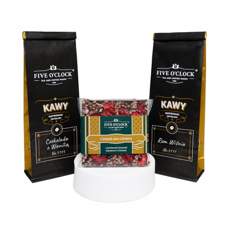 Uroczy upominek kawowy z aromatycznymi kawami o smakach rumu z wiśnią oraz czekolady z wanilią, uzupełniony mini czekoladką z liofilizowanymi owocami. Idealny mały prezent by sprawić komuś bliskiemu słodką, kawową przyjemność.