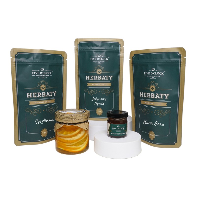 Ten zestaw to starannie wyselekcjonowane mieszanki owocowe, które zachwycają świeżością i naturalną słodyczą. Dopełnieniem kompozycji są zamknięte w słoiczkach delikatesy — konfitura owocowa i pomarańcze w słodkiej zalewie, które idealnie komponują się ze smakiem owocowych naparów.