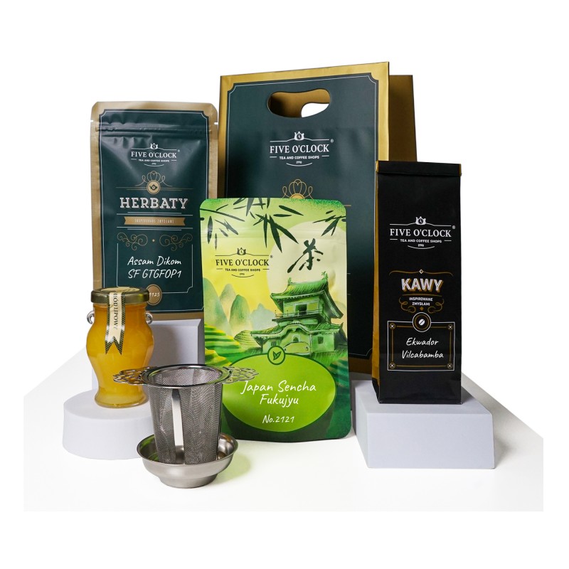 Ten zestaw to kwintesencja klasyki i różnorodności nut smakowych. Zawiera dwie starannie dobrane herbaty — czarną i zieloną — oraz aromatyczną kawę, które idealnie komponują się z naturalnym miodem. Elegancki, a zarazem praktyczny zaparzacz pozwoli szybko i wygodnie przygotować idealny napar. To prezent dla tych, którzy cenią sobie prostotę, smak i funkcjonalność w codziennym rytuale picia herbaty i kawy.