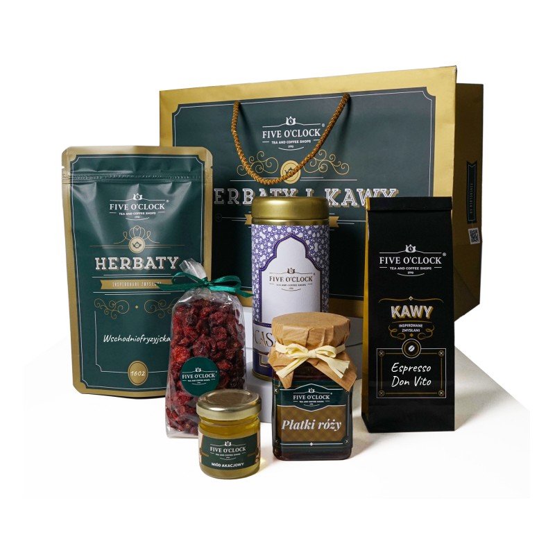 Podaruj zestaw, który zachwyci harmonią smaków. W eleganckiej torbie znajdziesz aromatyczne herbaty, wyrazistą kawę oraz szlachetne dodatki: miód, konfiturę różaną oraz żurawinę w cukrze trzcinowym. To klasyczna kompozycja, która sprawi bliskiej osobie wyjątkową przyjemność.
