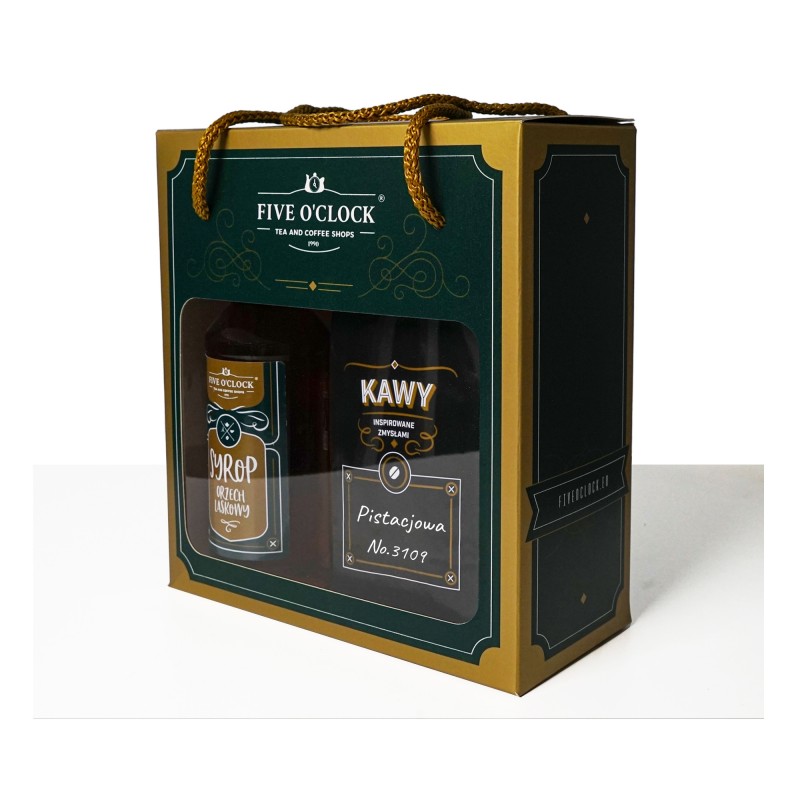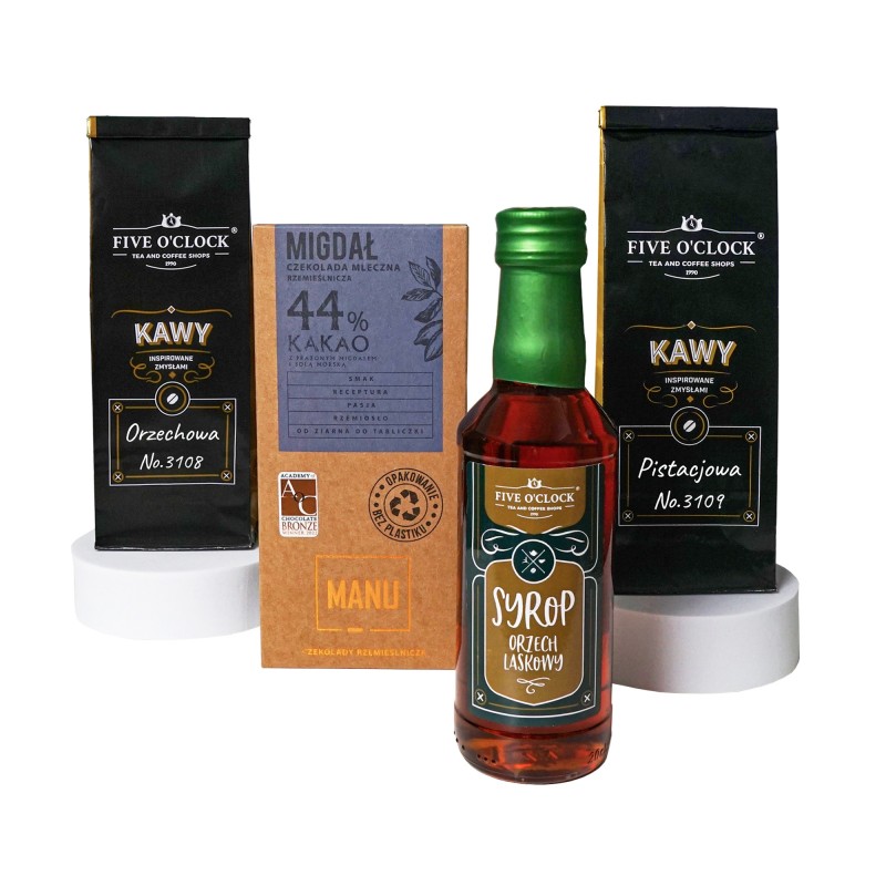 Eleganckie pudełko skrywa dwie aromatyzowane kawy - pistacjową i orzechową. Smak naparów doskonale dopełnia syrop, a dołączona czekolada nadaje całości wyjątkowego, orzechowego charakteru.