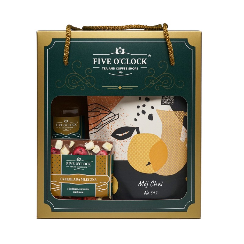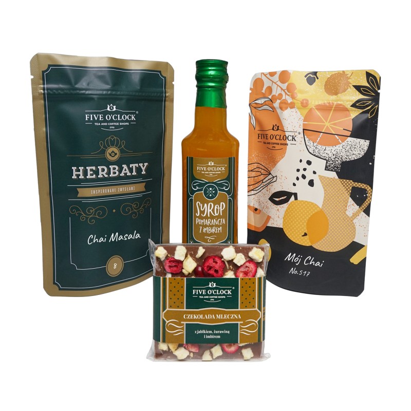 Rozgrzewający, korzenny zestaw prezentowy idealny na chłodniejsze dni. W jego skład wchodzi aromatyczna herbata Chai Masala, ziołowa kompozycja Mój Chai, konfitura z plastrów pomarańczy w syropie oraz mała czekoladka. Bogactwo przypraw i cytrusowych nut tworzy przytulną, pełną ciepła kompozycję, która doskonale sprawdzi się jako nastrojowy i wyjątkowy upominek.