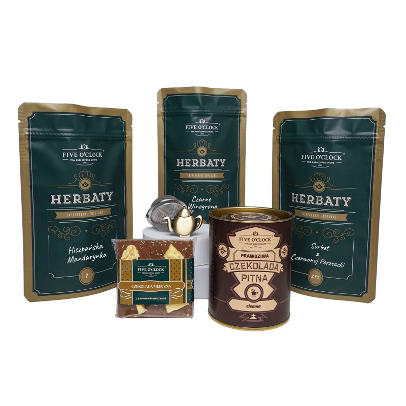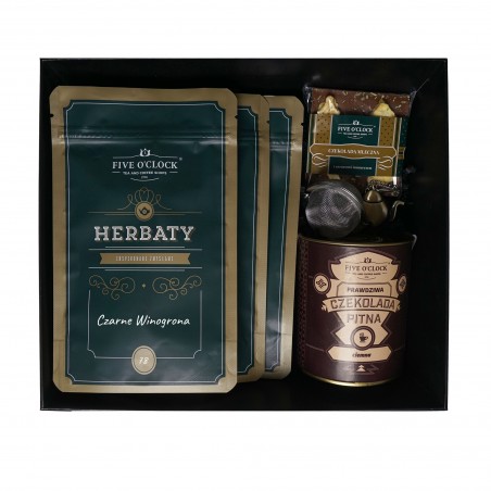 Elegancki zestaw prezentowy pełen ciekawych smaków, podany na stylowej tacy. W jego skład wchodzi czarna herbata z mandarynką, czarna herbata z winogronami oraz zielona herbata z czerwoną porzeczką. Całość uzupełnia aksamitna ciemna czekolada do picia, mała czekoladka z owocami oraz praktyczny zaparzacz. To harmonijne połączenie herbat i słodkich dodatków tworzy wyjątkowy, elegancki prezent na każdą okazję.