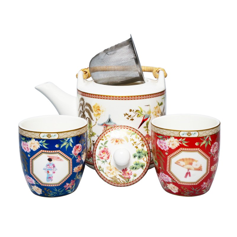 Porcelanowy zestaw do herbaty Jardins D'Orient z dwiema czarkami oraz dzbanuszkiem z metalowym filtrem. Piękno i wygoda użytkowania w orientalnym stylu.