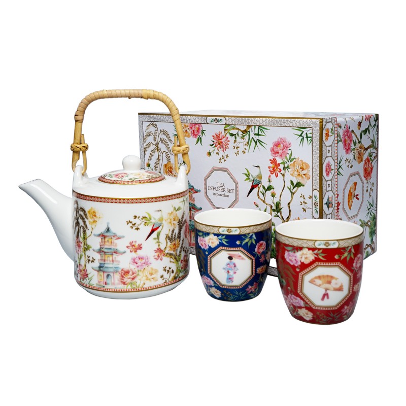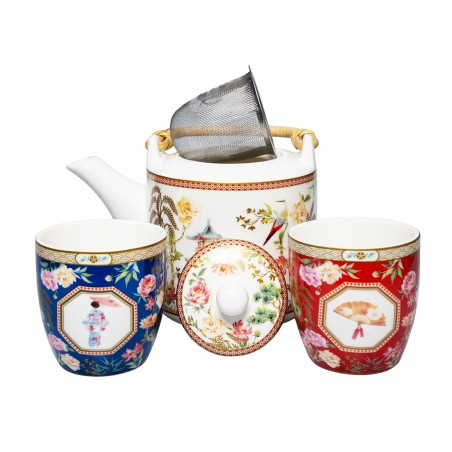 Porcelanowy zestaw do herbaty Jardins D'Orient z dwiema czarkami oraz dzbanuszkiem z metalowym filtrem. Dzbanuszek zyskuje uroku dzięki bambusowej rączce. Jego orientalny design i wysokiej jakości materiały zapewniają, że jest nie tylko funkcjonalny, ale także estetyczny. Ten zestaw idealnie sprawdzi spotkania rodzinne lub jako stylowy prezent dla najbliższych.