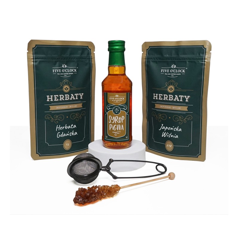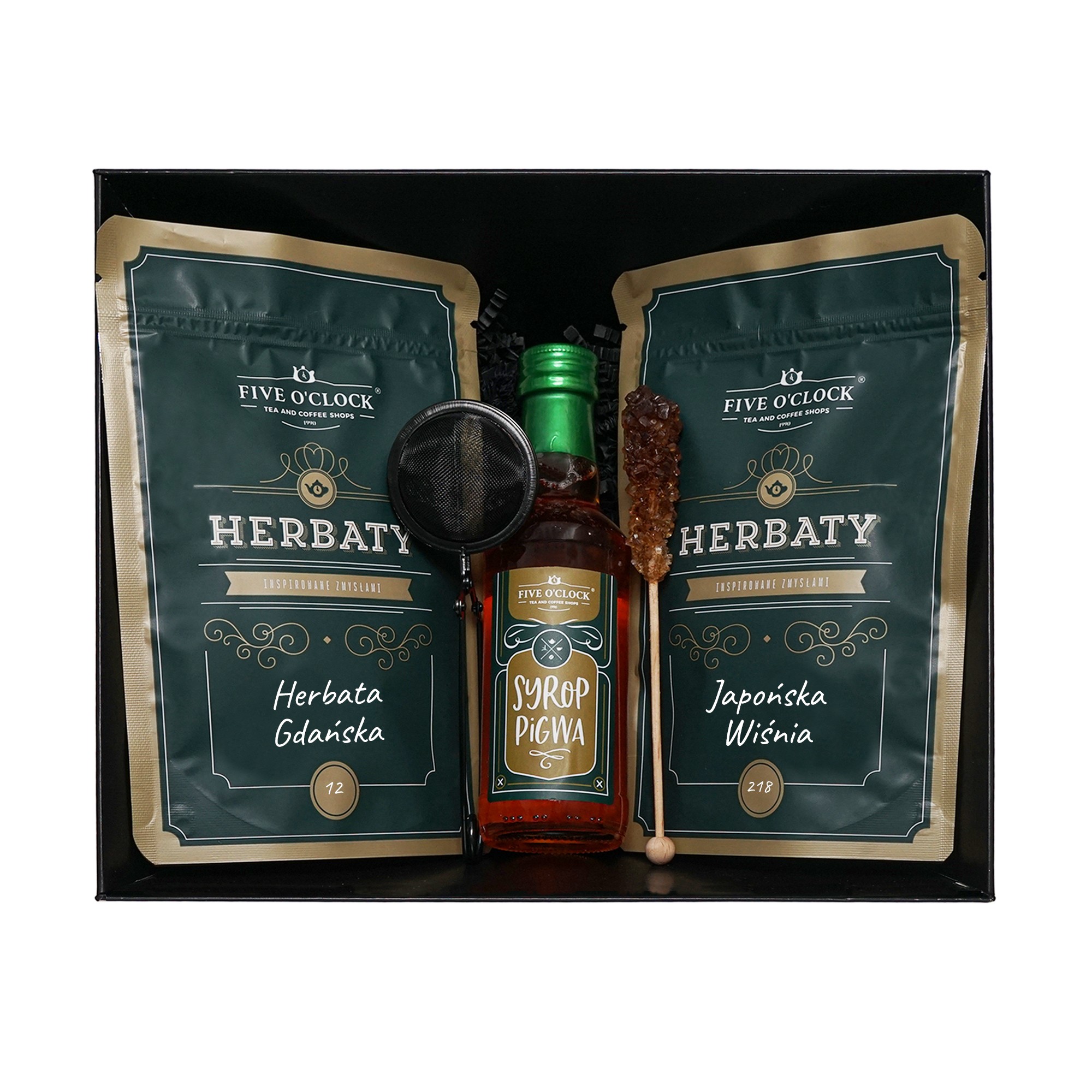 Elegancki zestaw prezentowy stworzony z myślą o osobach, które cenią smak, styl i dbałość o detale. W jego skład wchodzą dwie wyjątkowe kompozycje, zachwycające zarówno smakiem, jak i wyglądem - deserowa czarna herbata z orzechowym akcentem oraz zielona herbata w owocowej odsłonie .Całość dopełniają elegancki zaparzacz, pałeczka kandyzowa do subtelnego osłodzenia naparu oraz syrop z pigwy, który nadaje herbacie wyjątkowego charakteru. To doskonały pomysł na prezent, który łączy w sobie estetykę, smak i elegancję.