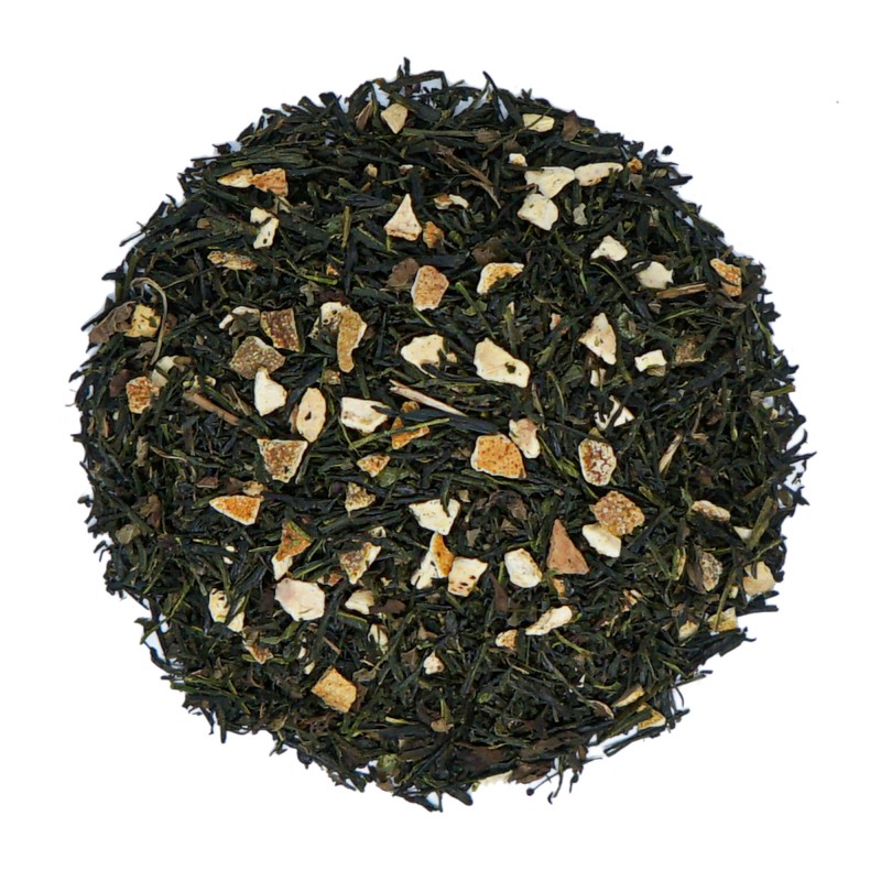 Japońska zielona herbata wysokiej jakości Gyokuro z dodatkiem skórki pomarańczy i liści melisy. Delikatna świeżość podkręcona cytrusowym akcentem. Jedwabiste orzeźwienie w japońskim stylu.